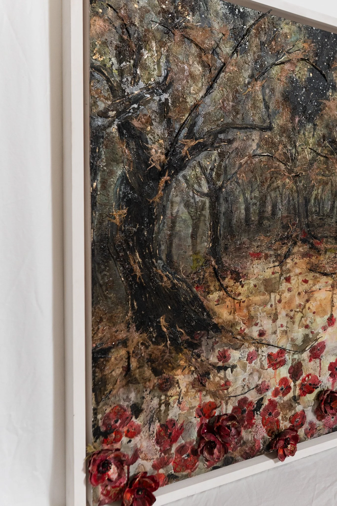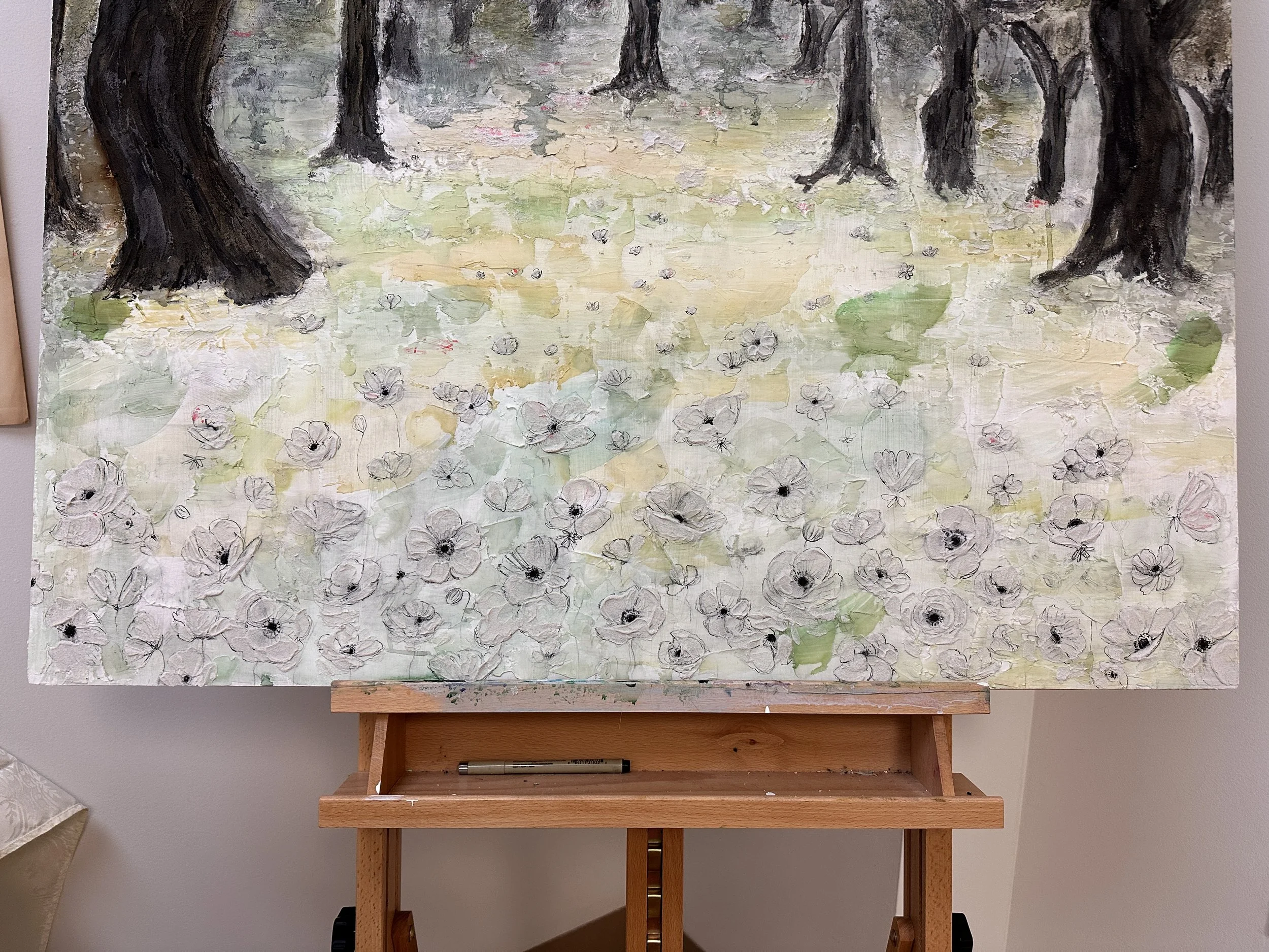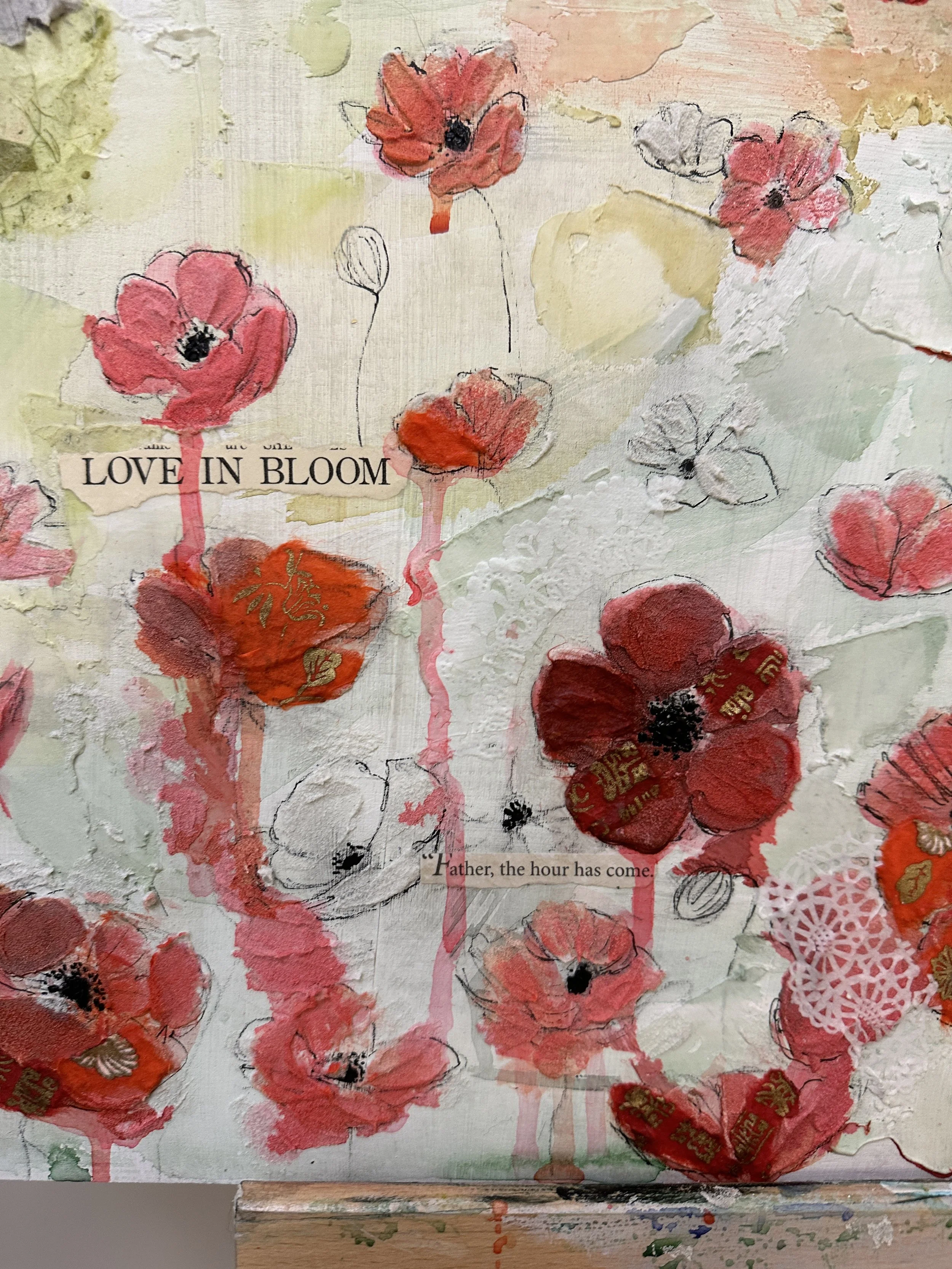 Reading this verse, I was awestruck by the visual and knew I had to capture it. I immediately began sketching what I saw in my mind—Jesus immersed in an olive grove, hanging from a tree—the picture in his mind that made him anguish. The foreground was to be covered in blood red poppies, reflecting both beauty and pain. Poppies grow in the Garden of Gethsemane each spring, which is something I discovered after choosing the flower to be the centerpiece. They’re even referred to as “drops of blood” for their significance.