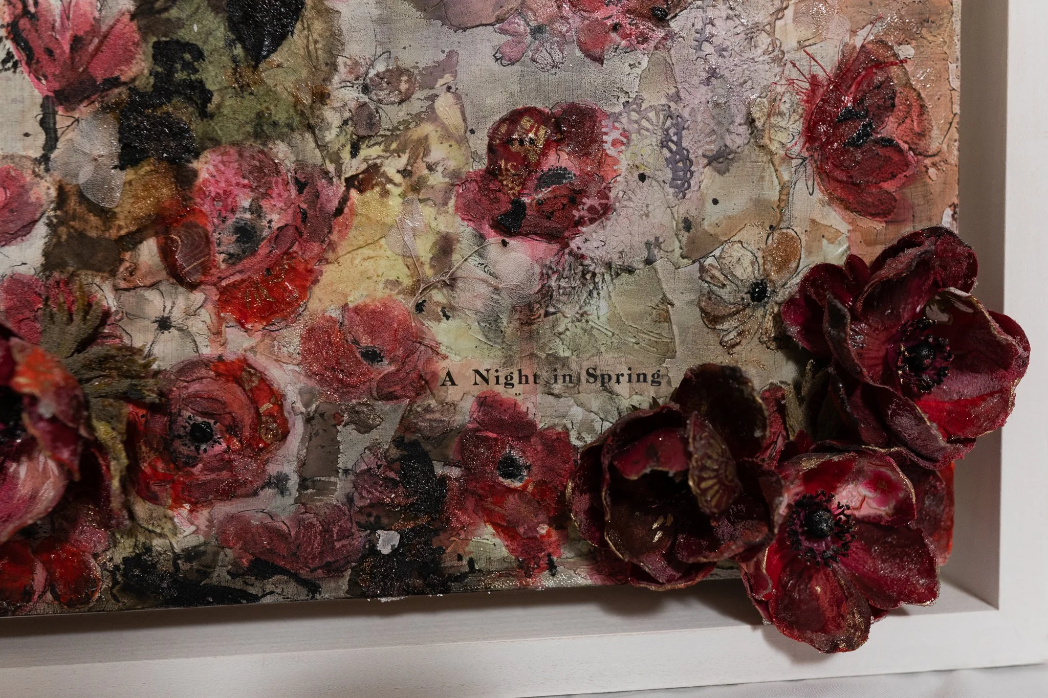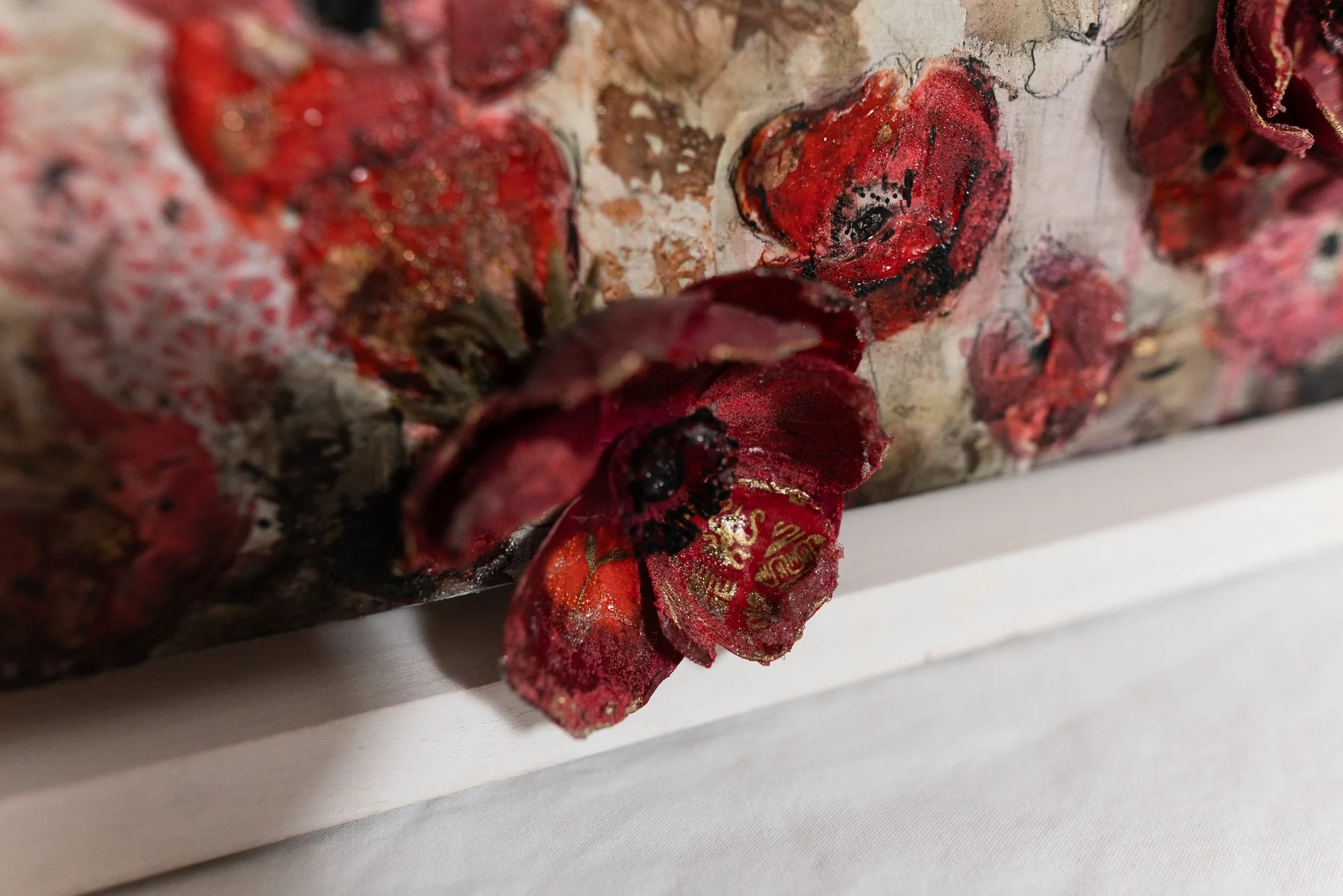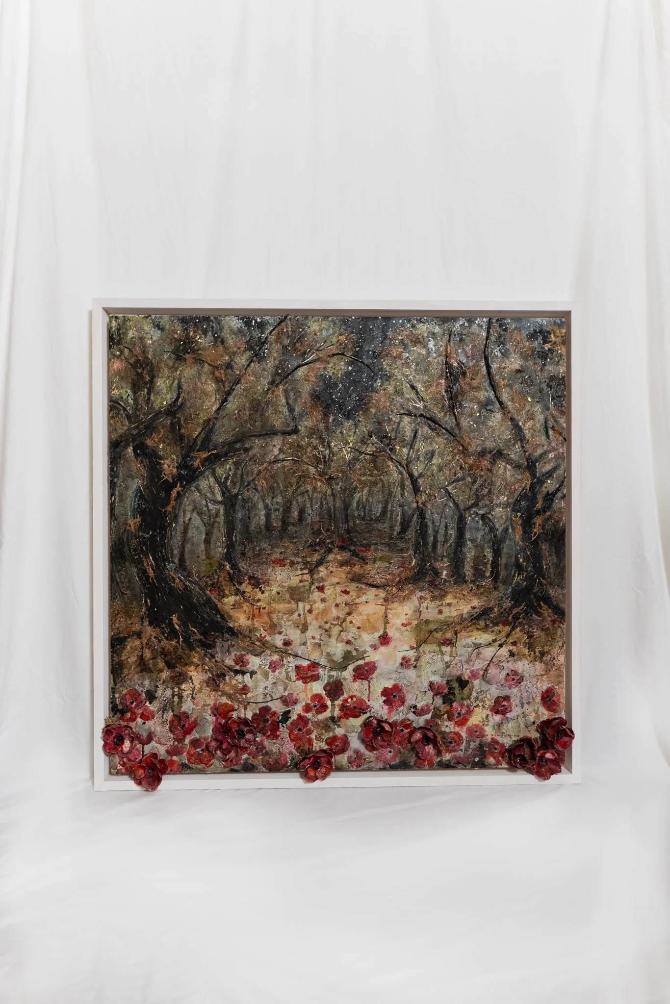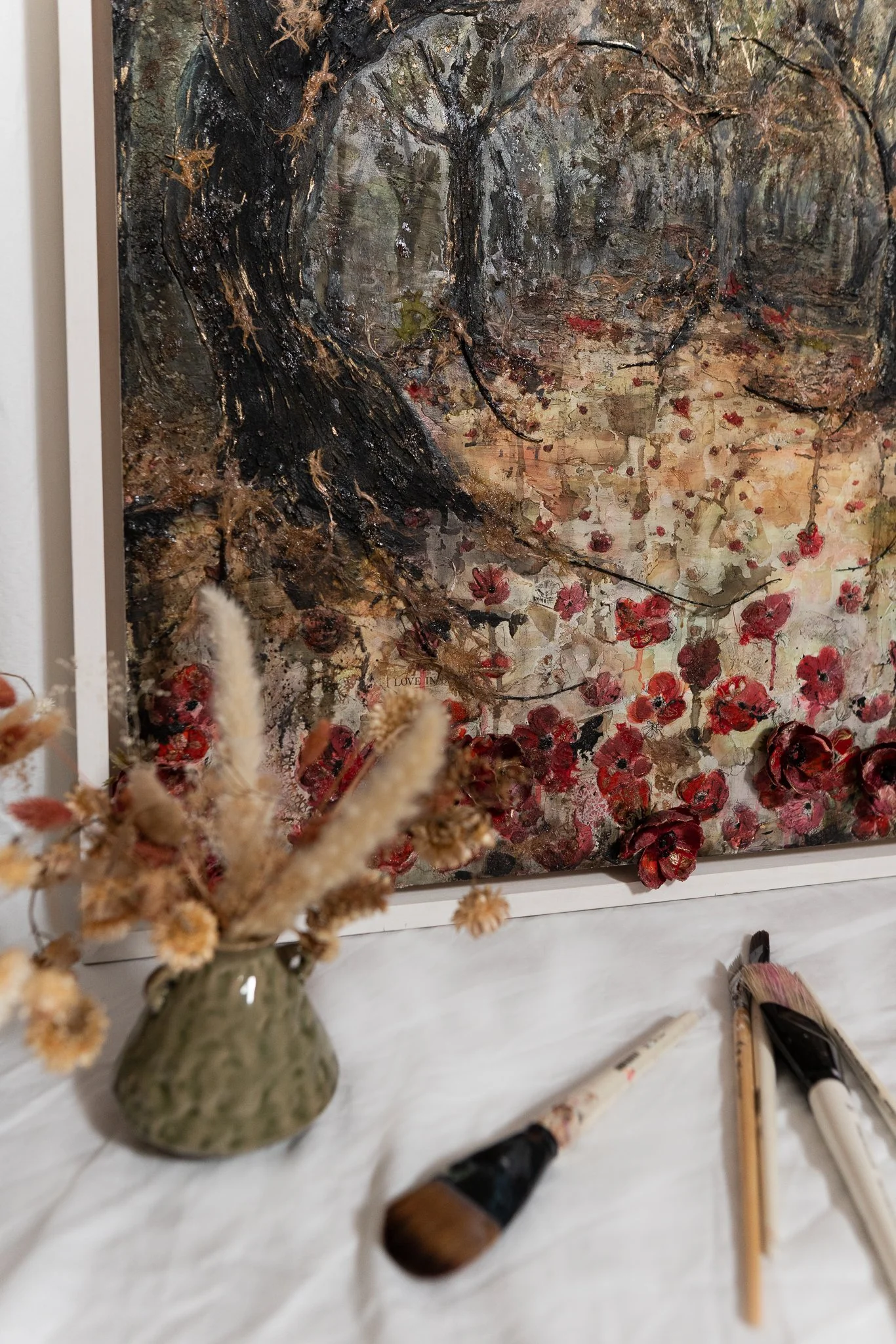 Reading this verse, I was awestruck by the visual and knew I had to capture it. I immediately began sketching what I saw in my mind—Jesus immersed in an olive grove, hanging from a tree—the picture in his mind that made him anguish. The foreground was to be covered in blood red poppies, reflecting both beauty and pain. Poppies grow in the Garden of Gethsemane each spring, which is something I discovered after choosing the flower to be the centerpiece. They’re even referred to as “drops of blood” for their significance.