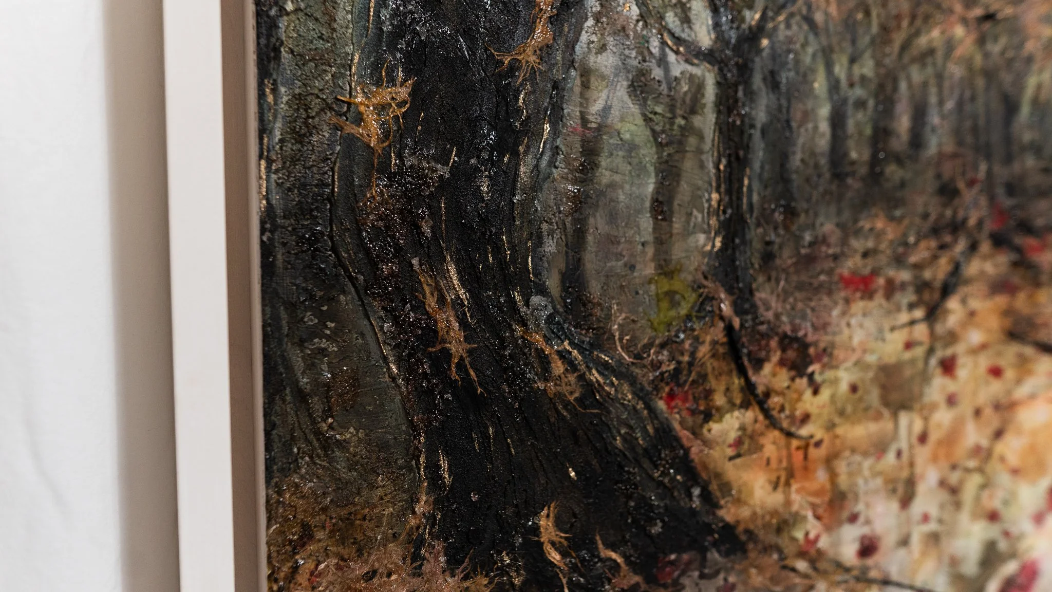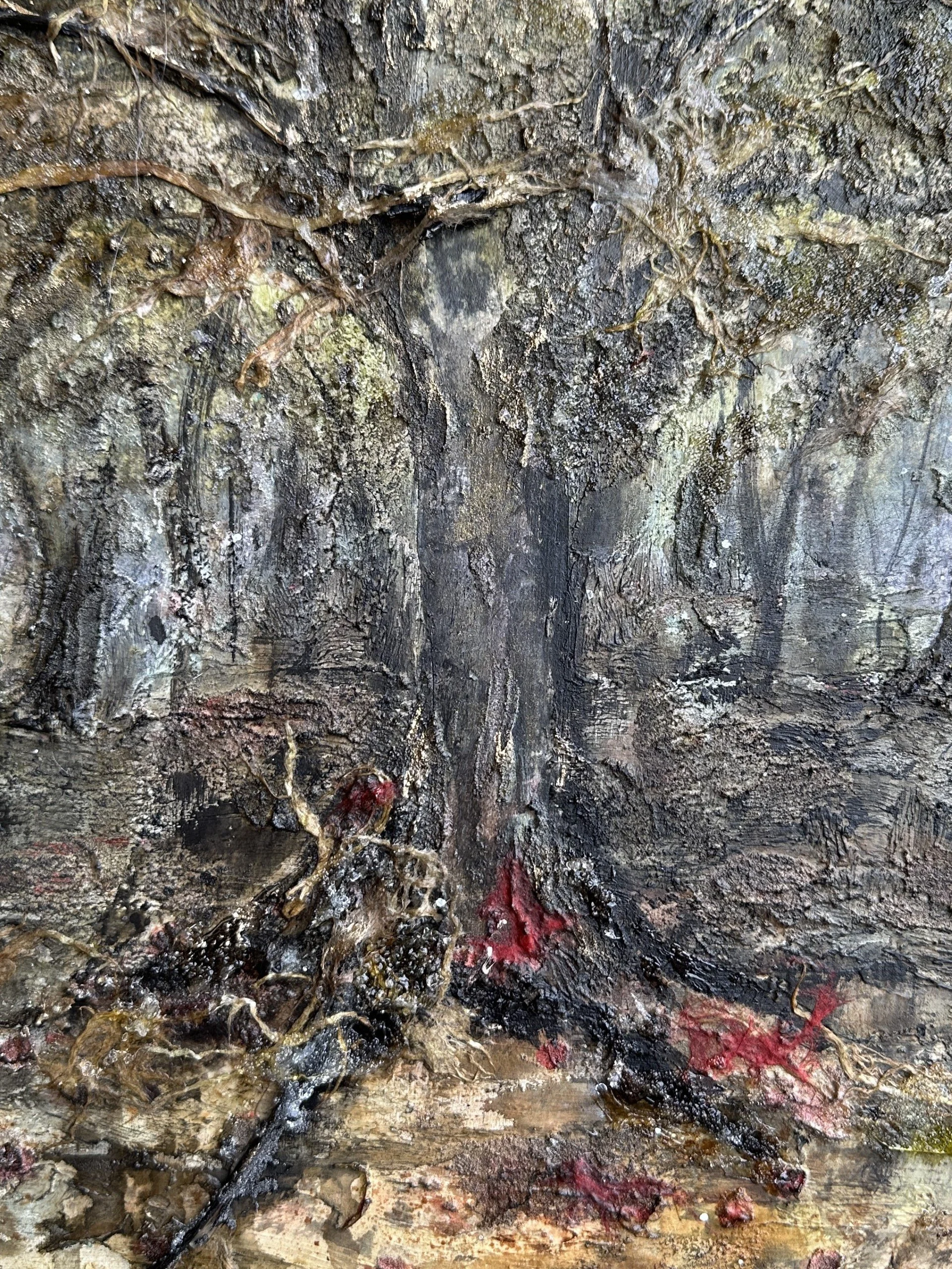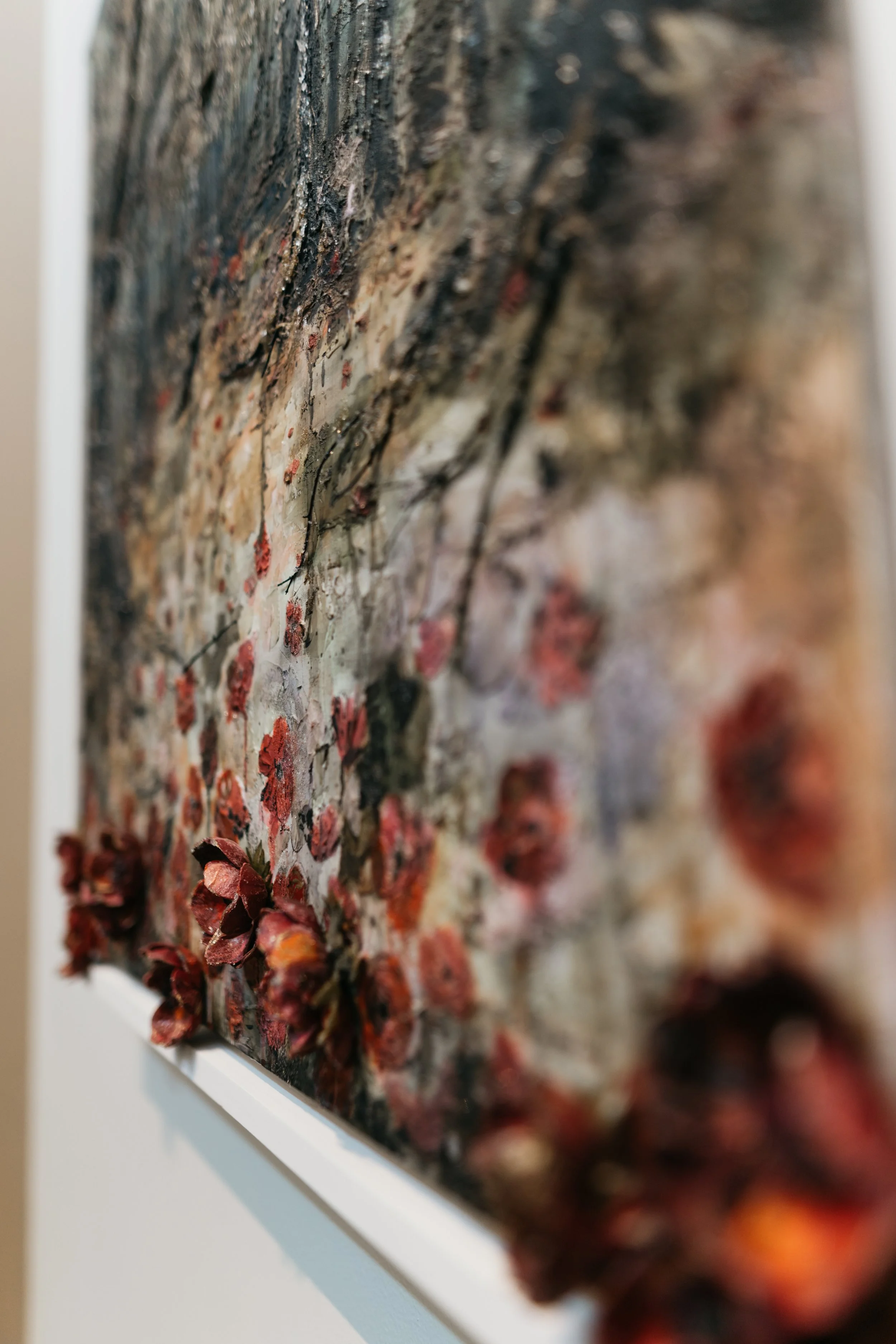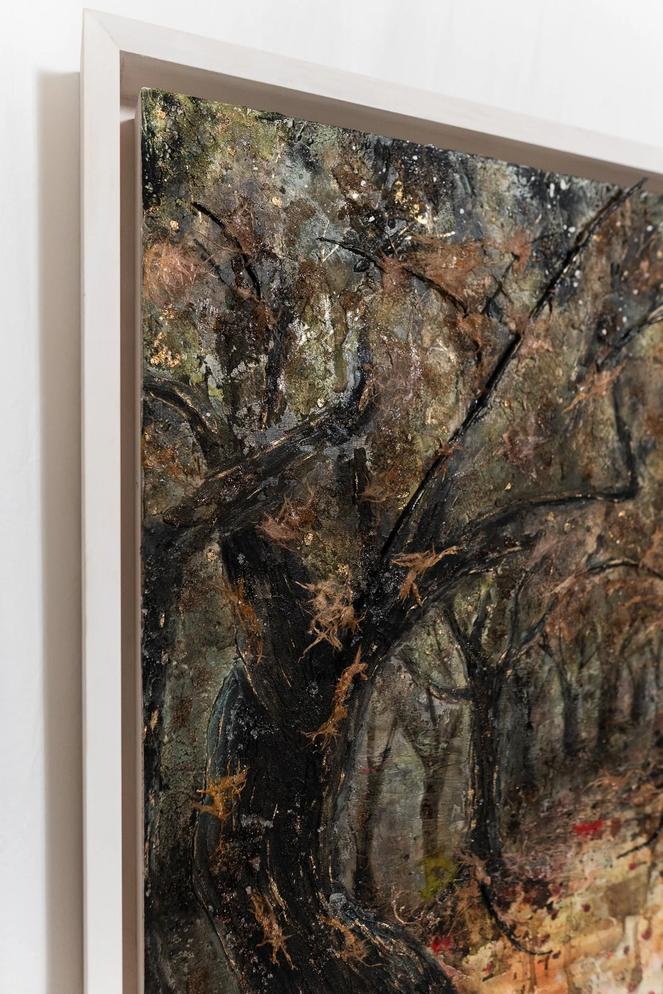 Gel-transfer, charcoal, ceramic stucco, walnut ink, acrylic, handmade paper, glass beads, collage, silk flowers, found twigs, gold leaf