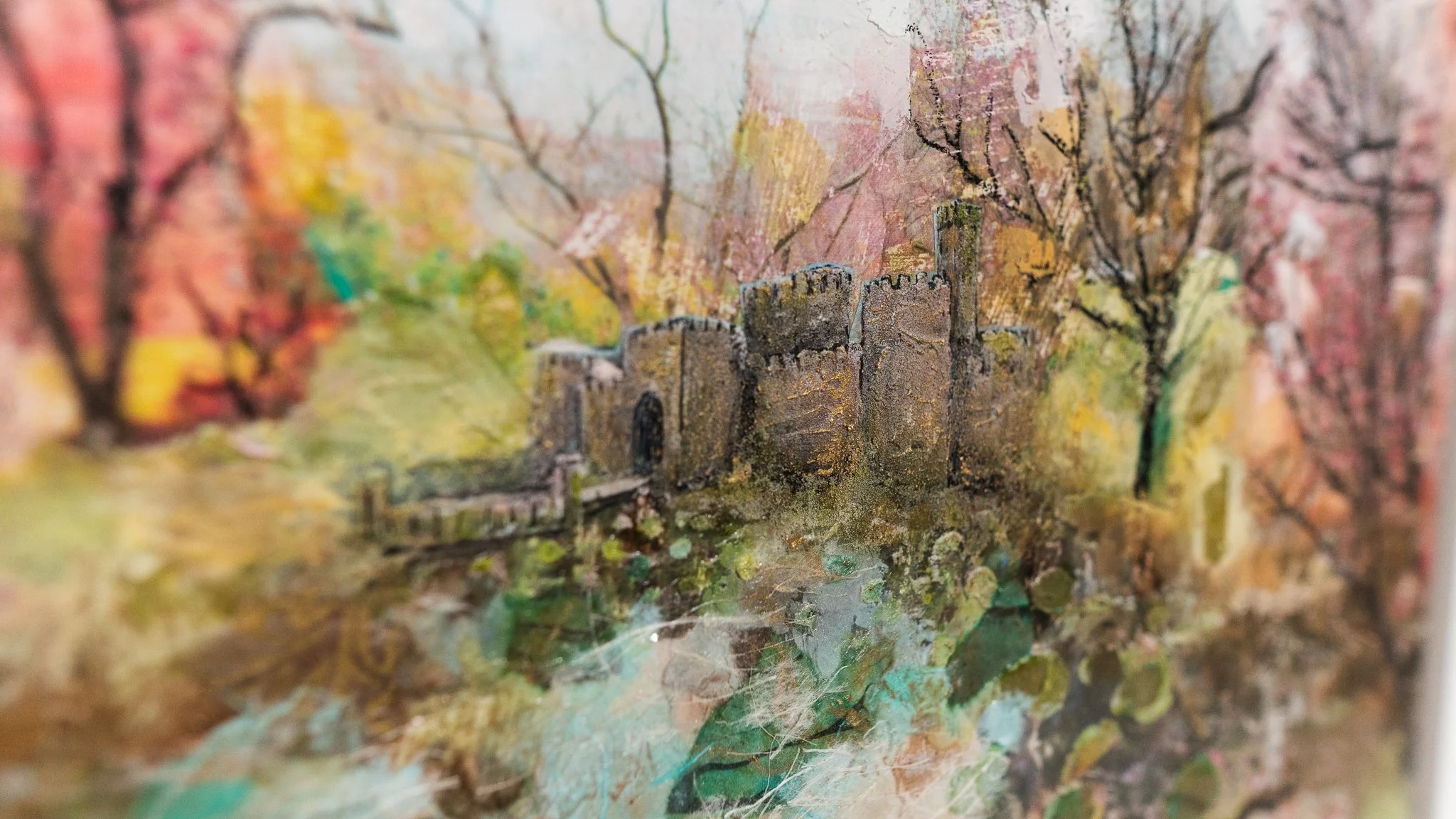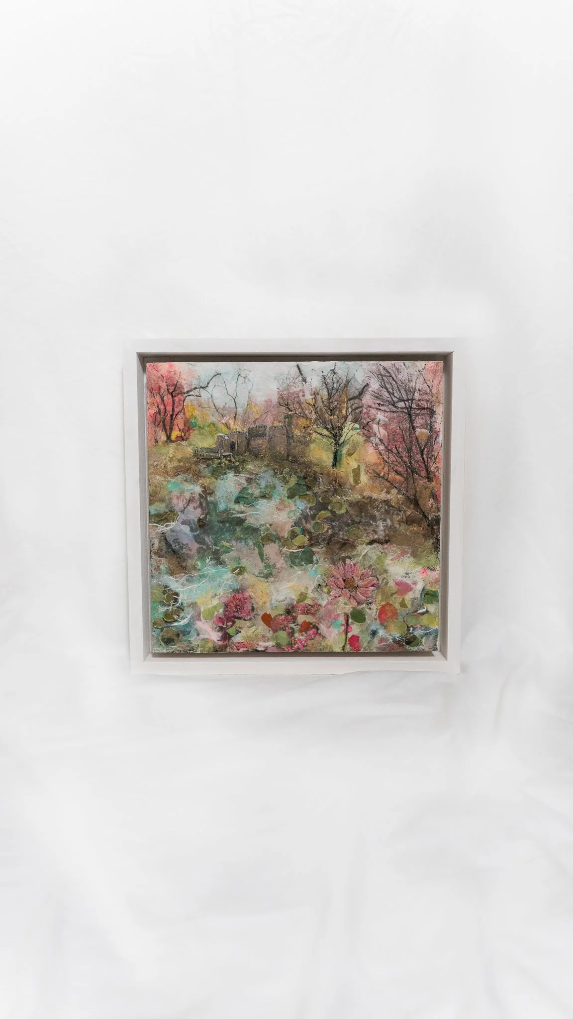 Gel-transfer, ceramic stucco, acrylic, handmade paper, iridescent ink