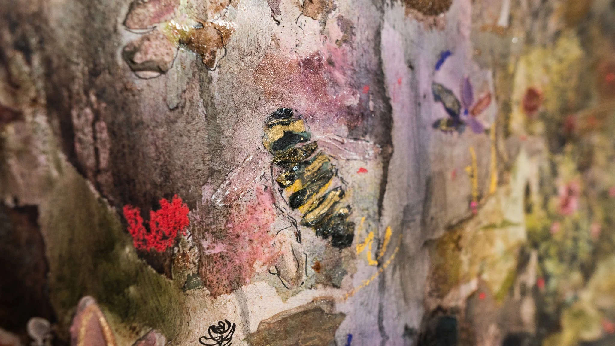 Gel-transfer, ceramic stucco, walnut ink, handmade paper, glass beads, gold leaf pen